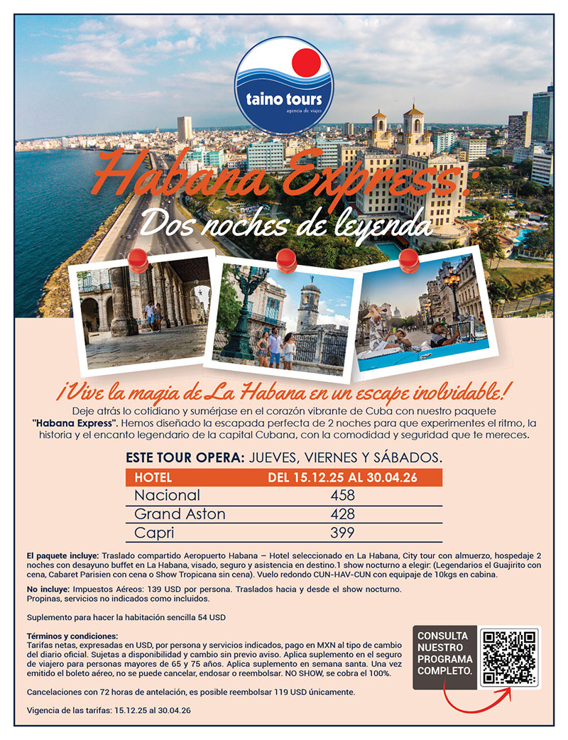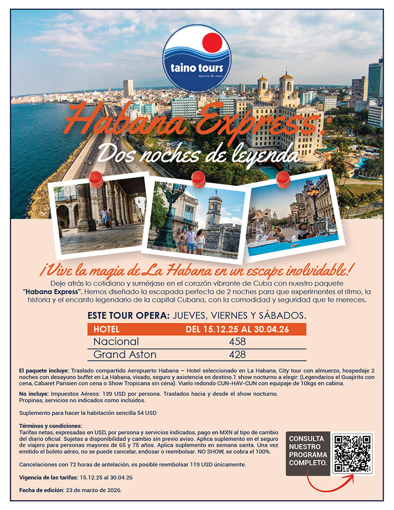 Box Lunch (Previa coordinación con el hotel). Traslado hacia el Aeropuerto Internacional José Martí en La Habana para regreso a Cancún.